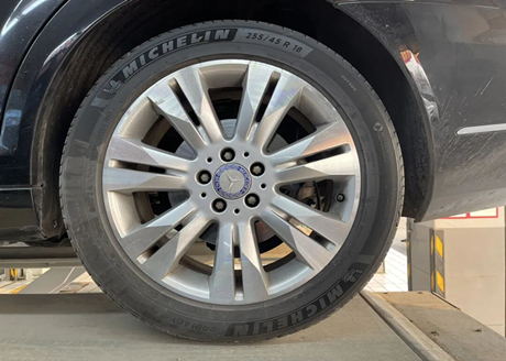 Все четыре шины — Michelin. Как показано на боковой стороне шины на фотографии, модель — 255/45 R18, что больше, чем у обычных автомобильных шин, и дороже, чем у большинства других марок шин.