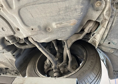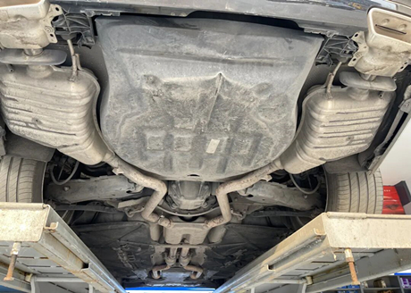 При осмотре средней части шасси на войлочных защитных пластинах по обеим сторонам выхлопной трубы имеются царапины, но это не влияет на её функциональность. В верхней части выхлопной трубы расположен теплозащитный экран, а верхняя часть теплозащитного экрана — это карданный вал.