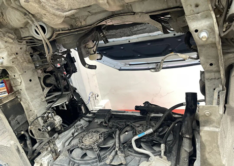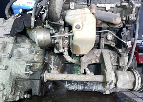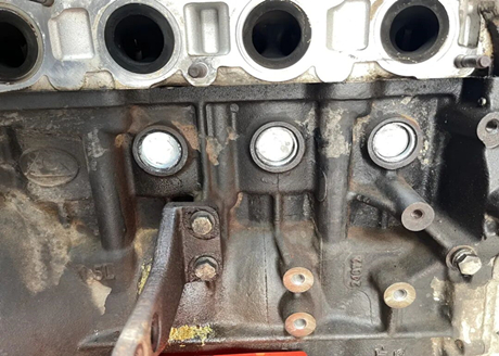 Мастер сказал, что блок цилиндров двигателя изготовлен из чугуна, три цилиндра расположены со стороны турбокомпрессора, три — со стороны впускного коллектора и один — в задней части двигателя, со стороны трансмиссии, как показано на рисунке ниже, точно в месте крепления к трансмиссии! Мастер также сказал, что засорение и утечка воды очень серьёзные. Протекающая вода попадает непосредственно между двигателем и коробкой передач, и явные признаки утечки видны снизу.