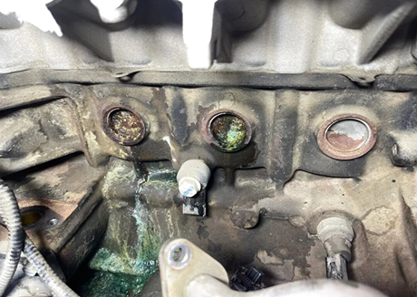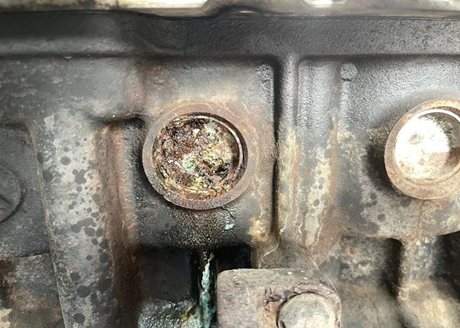 Мастер сначала открыл капот двигателя, и действительно, в емкости с антифризом не хватало жидкости. После проверки трубок системы охлаждения, водяных баков и других подверженных поломкам компонентов никаких проблем обнаружено не было. Однако на блоке цилиндров были обнаружены многочисленные следы утечки антифриза, что встречается довольно редко!