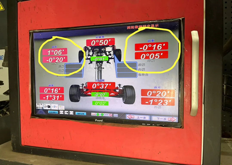 После подключения устройства данные о шасси отображаются так, как показано на рисунке. Техник сказал, что жёлтая область отображает значение схождения передних колёс, которое неверно и требует корректировки. Но у меня есть вопрос. Если владелец автомобиля заменит нижний рычаг и малую шатунную тягу, как изменятся данные о шасси?