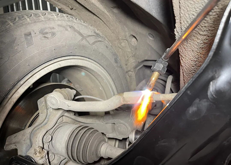 机翻 · 通用领域 Чтобы отрегулировать схождение передних колёс, необходимо ослабить стопорную гайку и повернуть внутреннюю рулевую тягу. Однако водитель не может повернуть внутреннюю рулевую тягу, поэтому её необходимо нагреть огнём, как показано на рисунке, до очень высокой температуры. После нагревания схождение можно отрегулировать, повернув внутреннюю рулевую тягу.