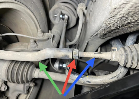 Как показано на следующем рисунке, синяя стрелка указывает на внутреннюю рулевую тягу, которая закреплена на рейке рулевого механизма с внутренней стороны; зеленая стрелка указывает на внешнюю рулевую тягу, при этом левый шаровой шарнир соединен с поворотным кулаком; красная стрелка указывает на стопорную гайку, которая используется для фиксации внутренней и внешней рулевых тяг.