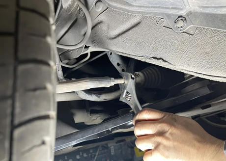 Как показано на рисунке ниже, ремонтник поворачивает внутреннюю рулевую тягу, чтобы отрегулировать схождение передних колес.